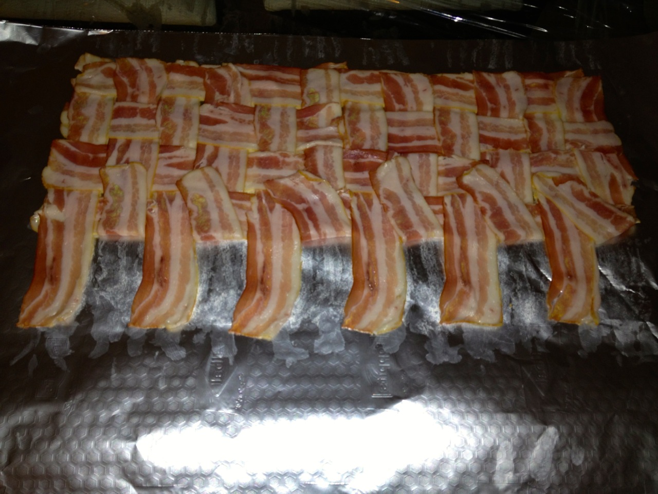 … miteinander verwebt. Dazu habe ich zuerst die senkrechten Bacon-Streifen hingelegt, danach jeden zweiten Streifen nach oben weggeklappt (wie auf dem Bild zu sehen ist) und dann waagrecht einen Streifen draufgelegt. Danach die nach oben geklappten Streifen zurückgeklappt und nun die anderen noch oben geklappt, dann folgt wieder ein waagrechter Streifen, usw..