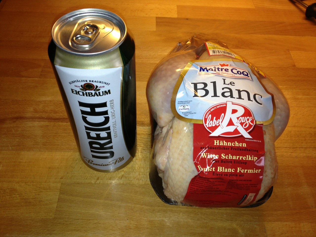 So nun mal mein erstes Bierdosen-Hähnchen, nach einem Rezept aus dem Grillbuch „Weber’s Chicken“. Dazu wird ein küchenfertiges Hähnchen (laut Rezept zwischen 2 – 2,5 kg) benötigt, ich hatte allerdings nur eines mit ca. 1,6 kg ergattern können. Neben Öl und Gewürzen, wird natürlich noch eine Dose Bier benötigt.