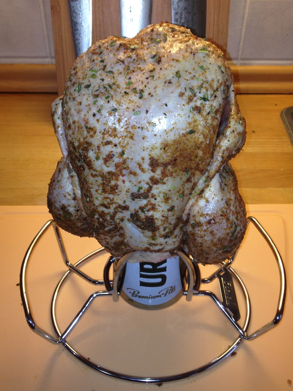 Den Grill für 200°C indirekte Hitze vorbereiten, ich hab dazu die zwei Kohlekörbe von Weber verwendet. Die Bierdose mit heißen Wasser gut säubern, öffnen und ca. die hälfte des Bieres abschütten (abtrinken). Zusätzlich oben in die Dose noch 2 – 3 Löcher rein machen. Nun das Hähnchen mit der Bauchhöhle so weit wie möglich über die Dose stülpen.