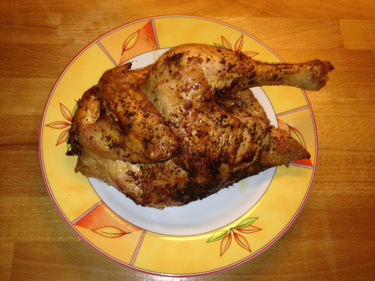 Mein Fazit: Geschmacklich wirklich nicht schlecht und recht saftig, aber ich hatte mir mehr erhofft. Nächstes mal wird weniger Kohle genommen und eine geringere Hitze von ca. 170°C eingestellt, dazu vielleicht noch eine andere Gewürzmischung. Das Hähnchen hatte zu schnell die 75°C Kerntemperatur erreicht.