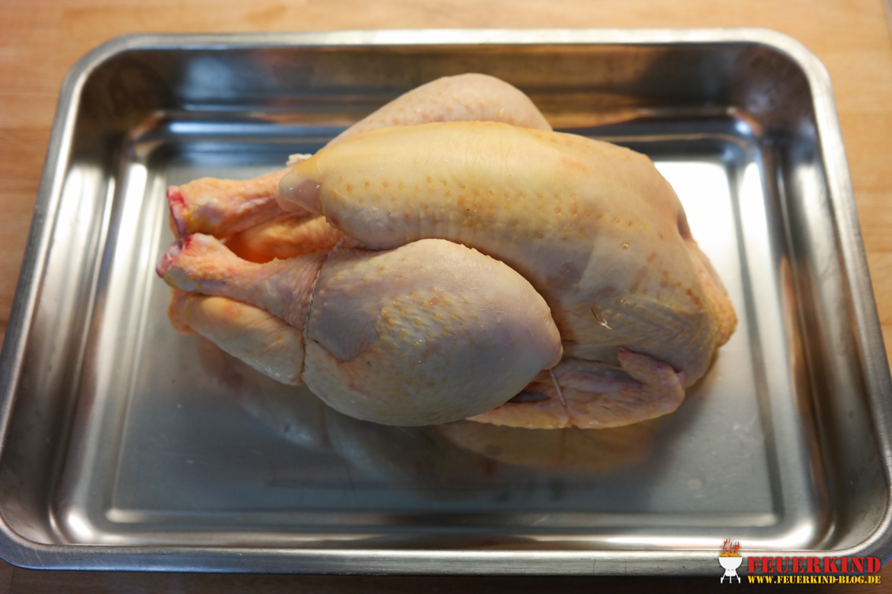 Heute gab es leckeres Grillhähnchen vom Drehspieß. Dies ist ein einfaches Rezept und der Arbeitsaufwand ist auch sehr gering. Zuerst braucht man natürlich ein gutes Hähnchen, ich nehme gerne dazu Freiland Hähnchen aus Loué (Frankreich). So ein Hähnchen kostet zwar seine 10 €, aber es lohnt sich definitiv und kein Vergleich zu einem billig Hähnchen aus dem Discounter. Ich hab diesmal ein Maishähnchen mit einem Gewicht von 1,5 kg genommen.