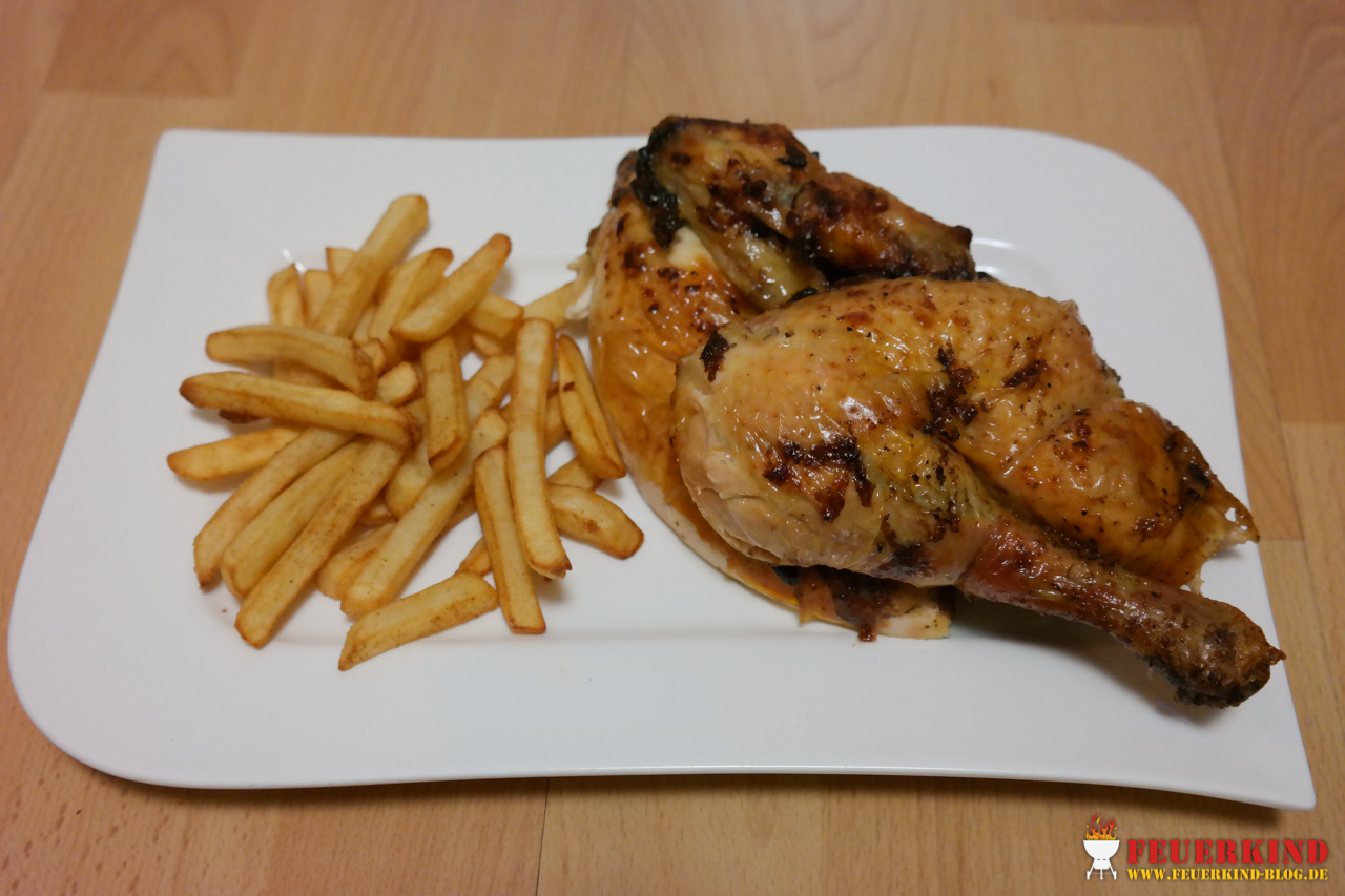 Wenn es 75°C hat nehme ich es herunter und lasse es noch 5-10 Minuten abgedeckt ruhen. So geht die Kerntemperatur noch auf 80°C hoch und das Hähnchen bleibt schön saftig. Nun noch das Hähnchen teilen und auf einem Teller anrichten. Als Beilage gab es Pommes aus dem Ofen.