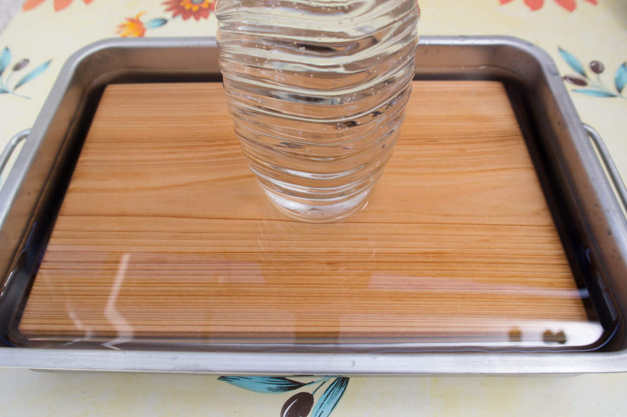 Heute wurde endlich mal die neue Zedernholzplanke eingeweiht, die ich auf einem Mittelaltermarkt erstanden habe. Das Zedernholz wurde zu Beginn für mindestens 1 Stunde gewässert. Dabei die Planke beschweren, damit sie komplett unter Wasser ist.