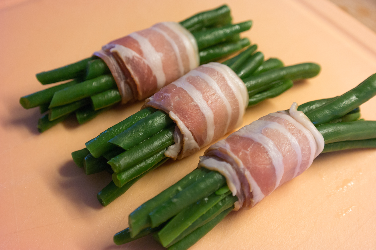 Nun noch die Enden abschneiden. Die Bohnen hab ich dann in kochendem Wasser, das mit Salz und Bohnenkraut gewürzt war, ca. 15 Minuten bissfest gegart. Im Anschluss die Bohnen abgeschreckt und zu kleinen Bündel in Speck eingewickelt. Das ganze wird dann später in der Pfanne (Grill ist ja dann belegt) angebraten, bis der Speck schön kross ist.