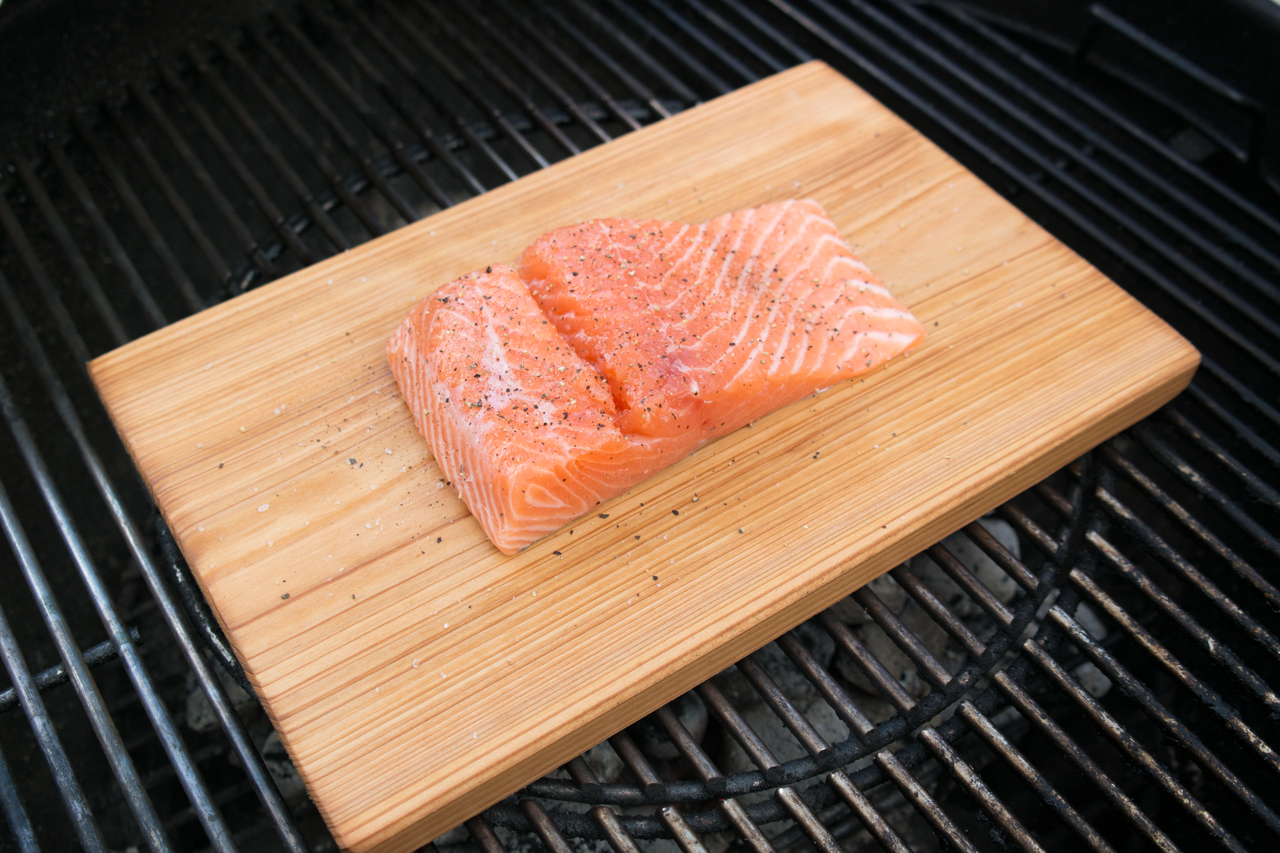 Parallel wurde der Grill für direkt Hitze (ca. 160-180°C) vorbereitet. Die Planke aus dem Wasser geholt, das Lachsfilet mit der Hautseite drauf gelegt, mit Salz und Pfeffer gewürzt und ab damit auf den Grill. Nun den Deckel schließen, damit der Lachs geräuchert wird und der herrlichen Duft des Zedernholz in den Fisch eindringen kann.